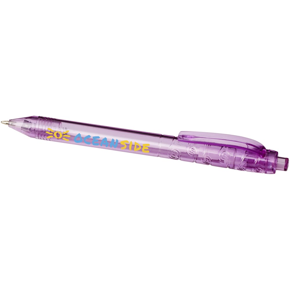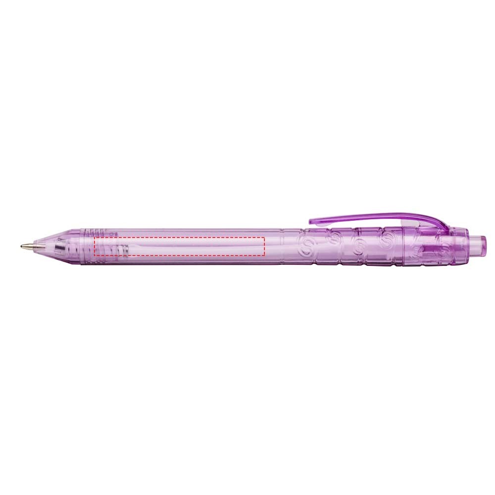 Balpen met klikmechanisme met een transparante huls. Het huls is gemaakt van gerecyclede waterflessen, wat bijdraagt aan het verminderen van de hoeveelheid plastic afval.