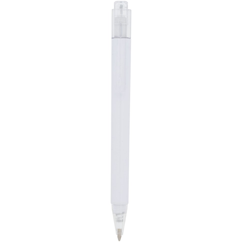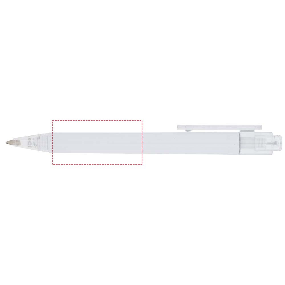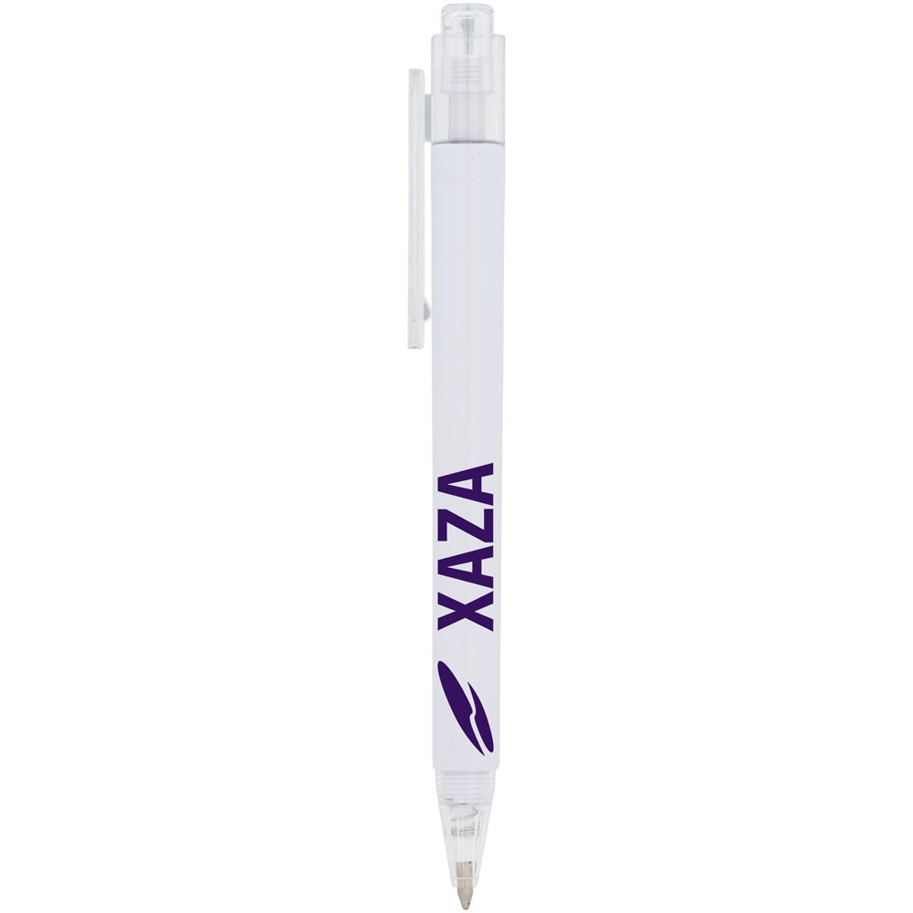 De Calypso-balpen heeft een gladde, witte greep met een doorschijnende gekleurde punt en clip.