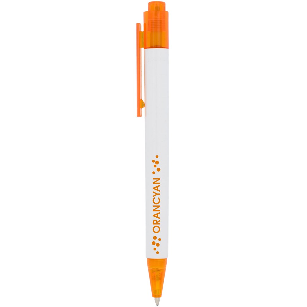 De Calypso-balpen heeft een gladde, witte greep met een doorschijnende gekleurde punt en clip.