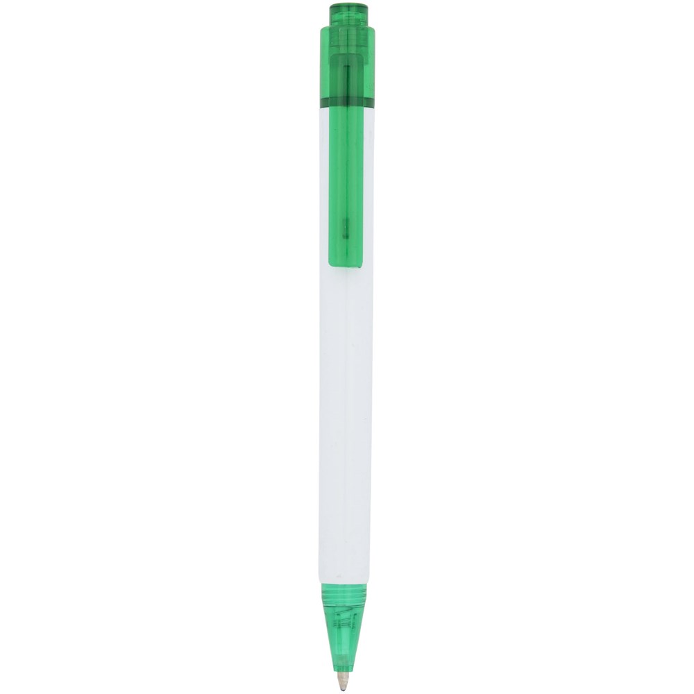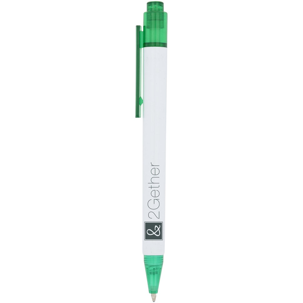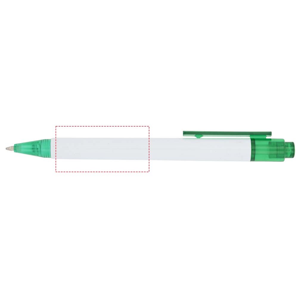 De Calypso-balpen heeft een gladde, witte greep met een doorschijnende gekleurde punt en clip.