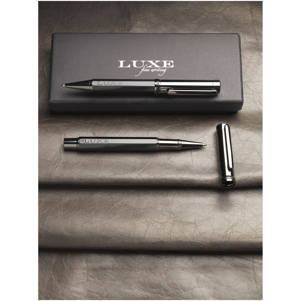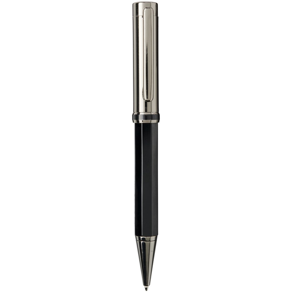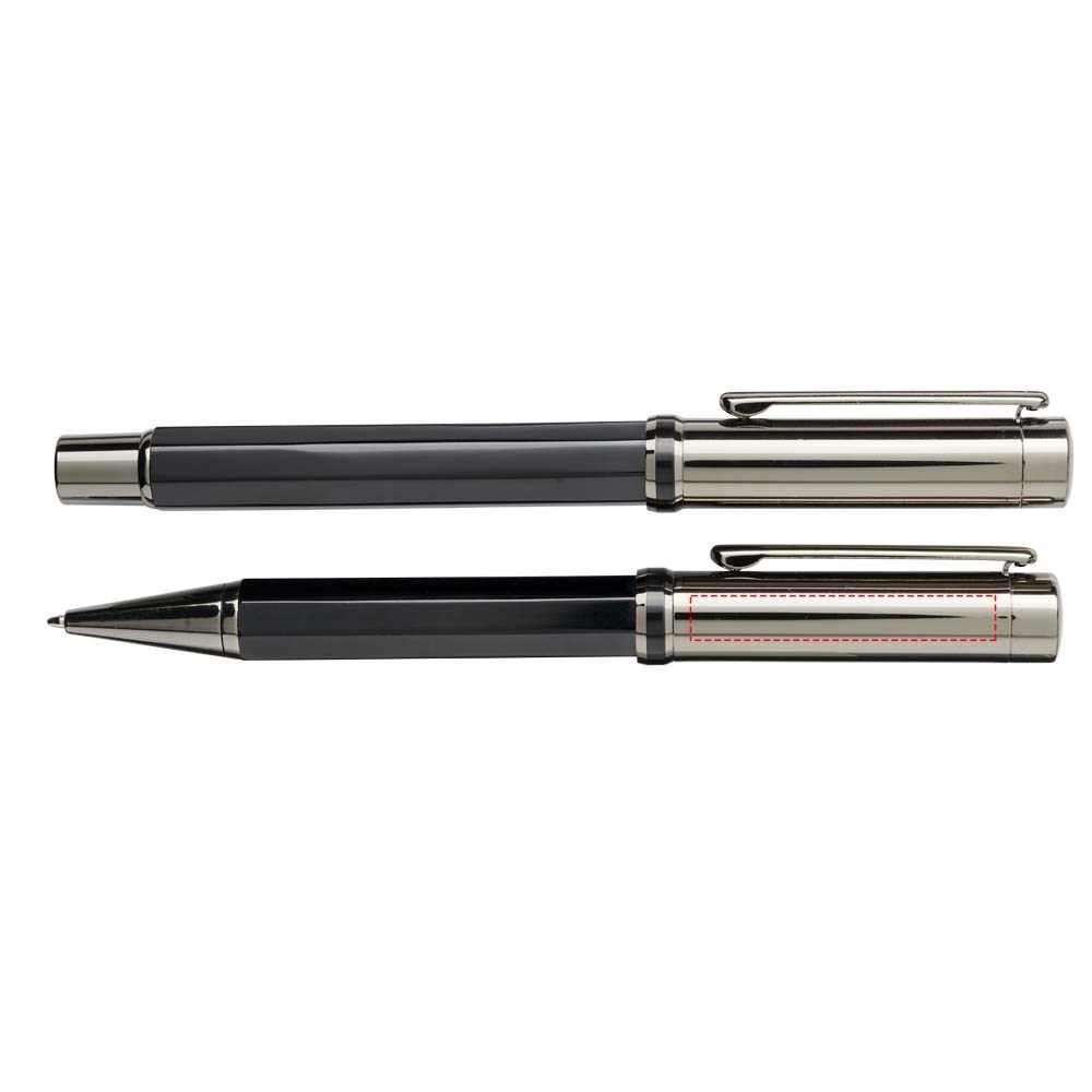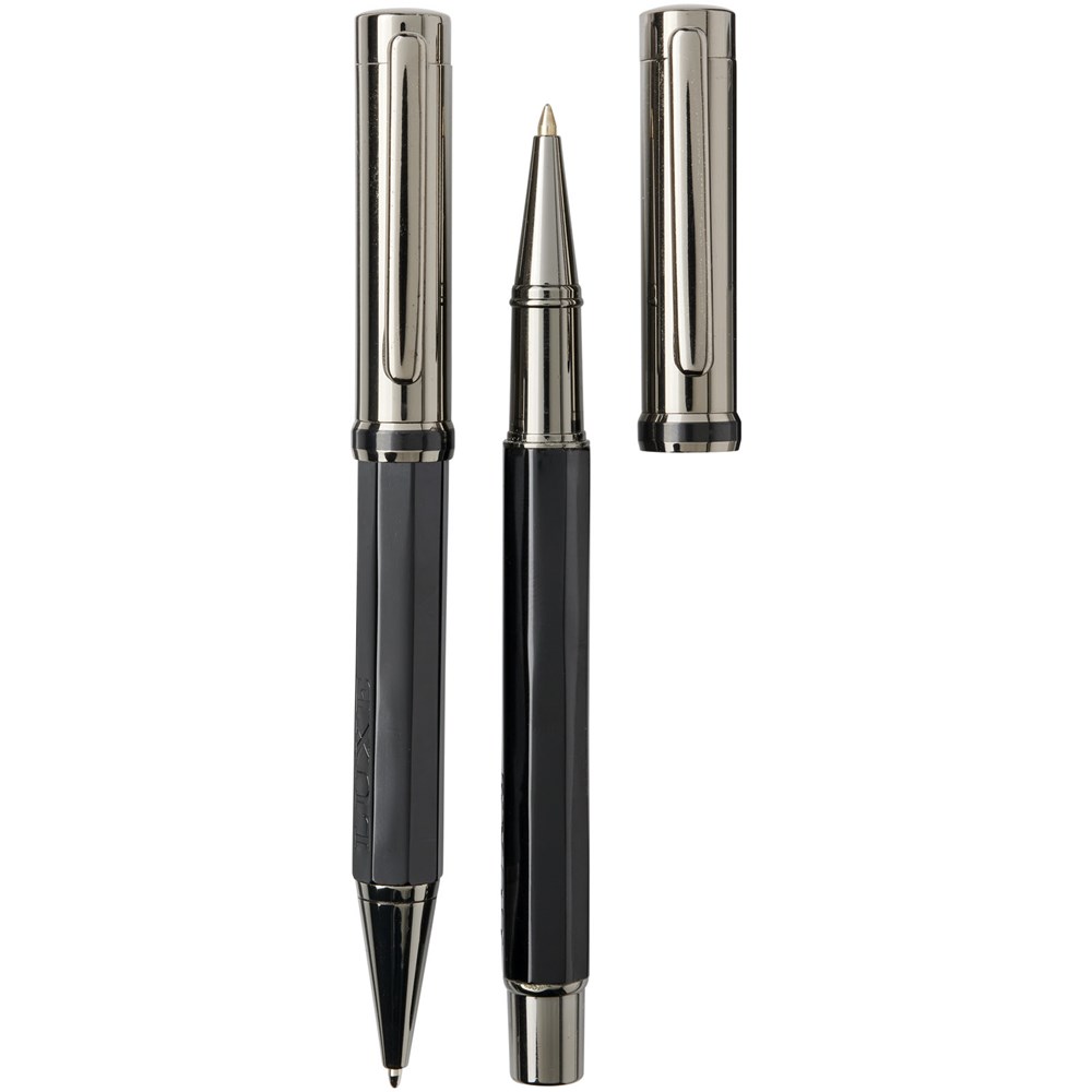 Balpen en rollerbalpen geschenkset in brons-koperen bovenhuls en zwarte octaëder aluminium onderhuls, geleverd in een luxe geschenkverpakking. Grootte van de balpen: 13,15 cm x 1,32 cm, gewicht: 34 gr, schrijflengte: 800m. Grootte van de rollerbalpen: 13,33 cm x 1,32 cm, gewicht: 39 gr, schrijflengte: 400 m.