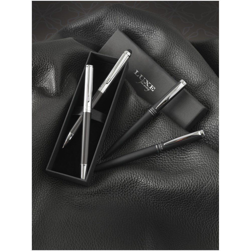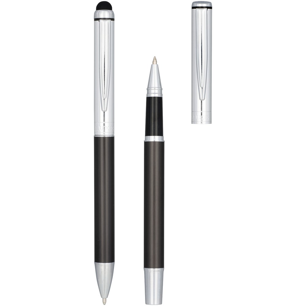 Exclusief ontworpen pennenset bestaande uit stylus/balpen en rollerball. Beide pennen hebben een schacht van grafiet (onderste helft) en gepolijst chroom (bovenste helft). Inclusief premium navulling (zwart). De stylus heeft een rubber dopje, ideaal voor de touchscreens van tablets en smartphones. Geleverd in ''LUXE'' geschenkverpakking (17 x 5,5 x 3 cm).