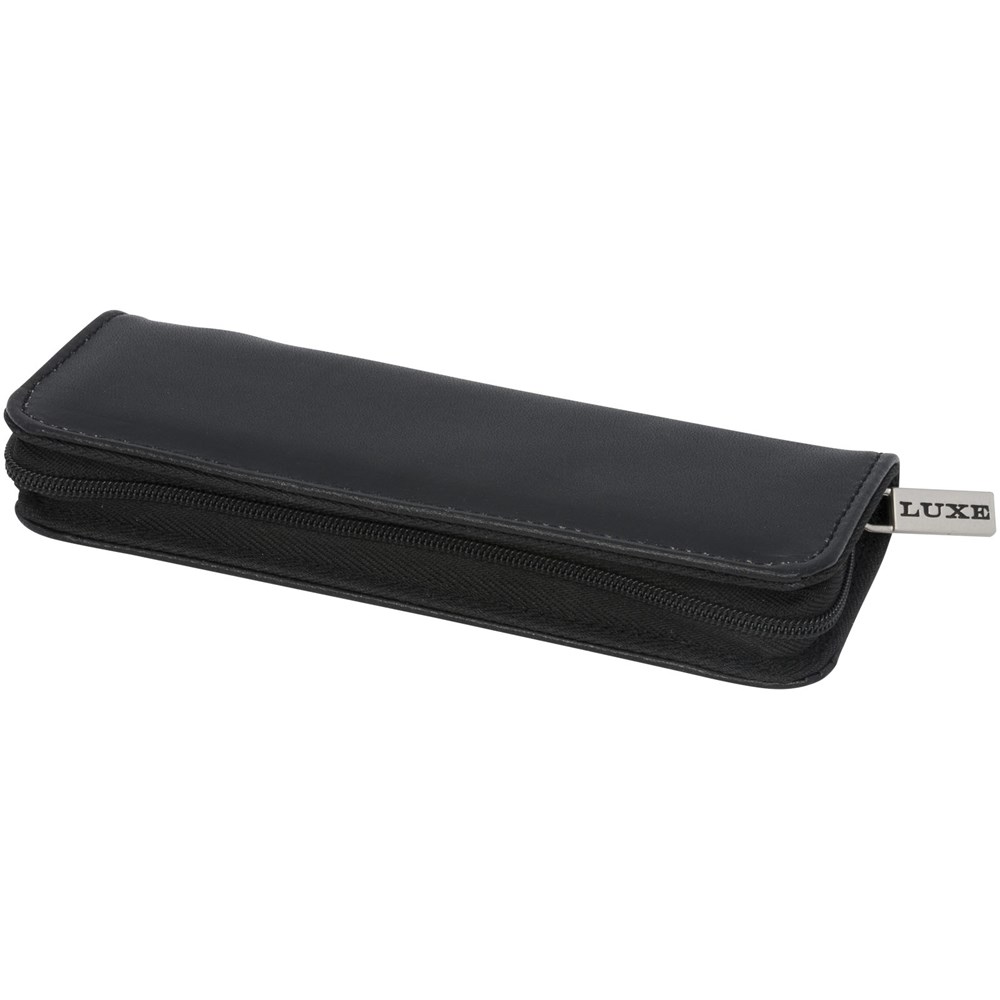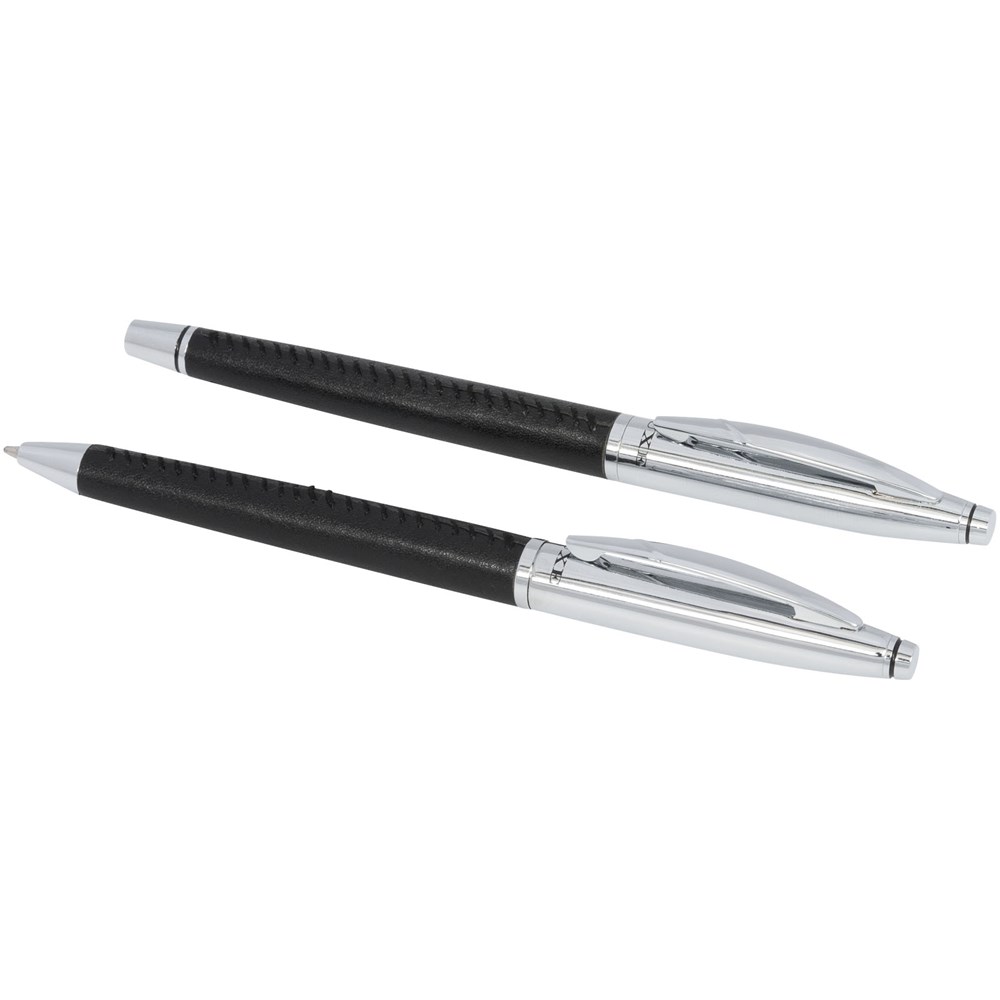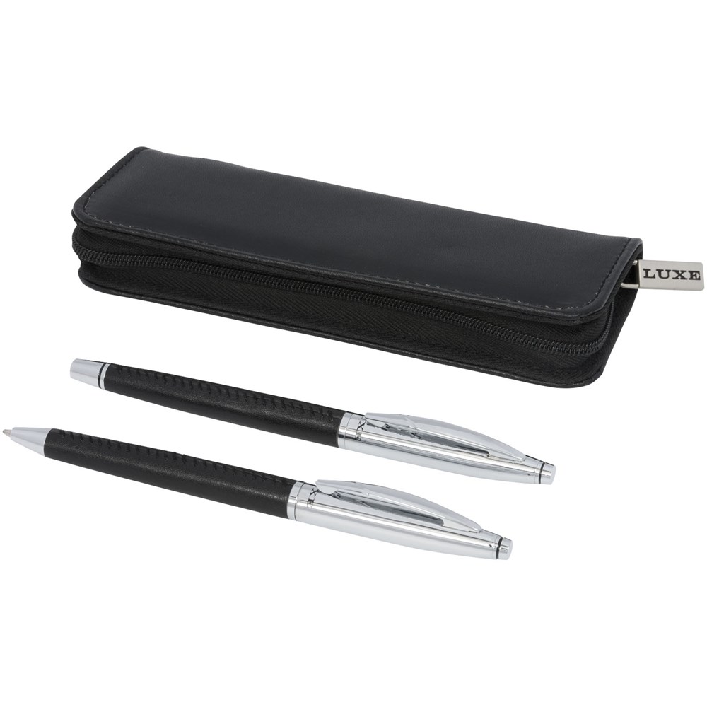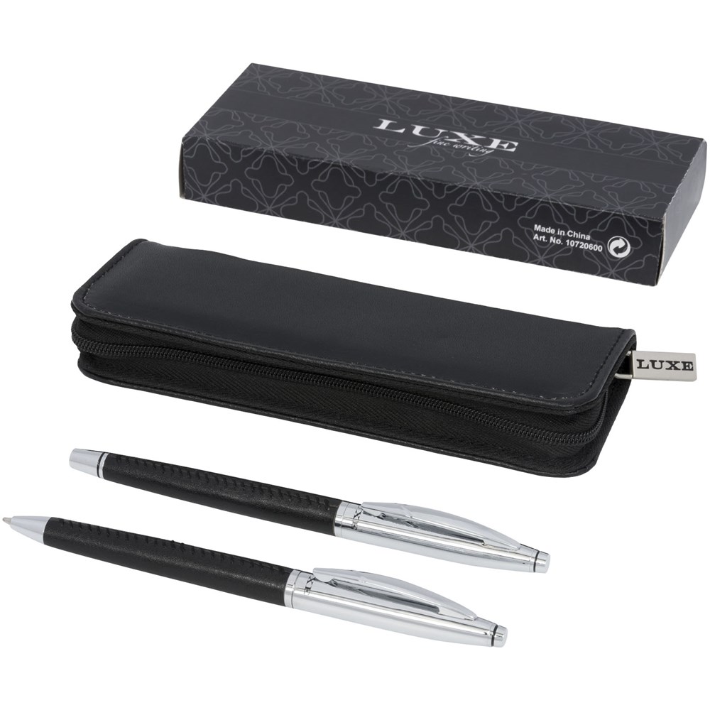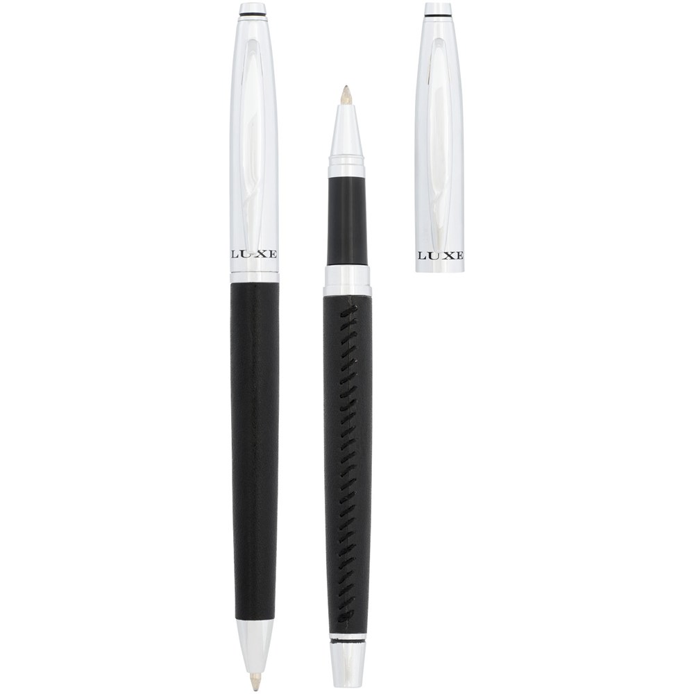 Exclusief ontworpen elegante balpen en rollerballpen geschenkset. Met leer omwikkeld en voorzien van moderne contraststiksels. Bevat een imitatieleren dubbele etui in een “LUXE” geschenkverpakking.
