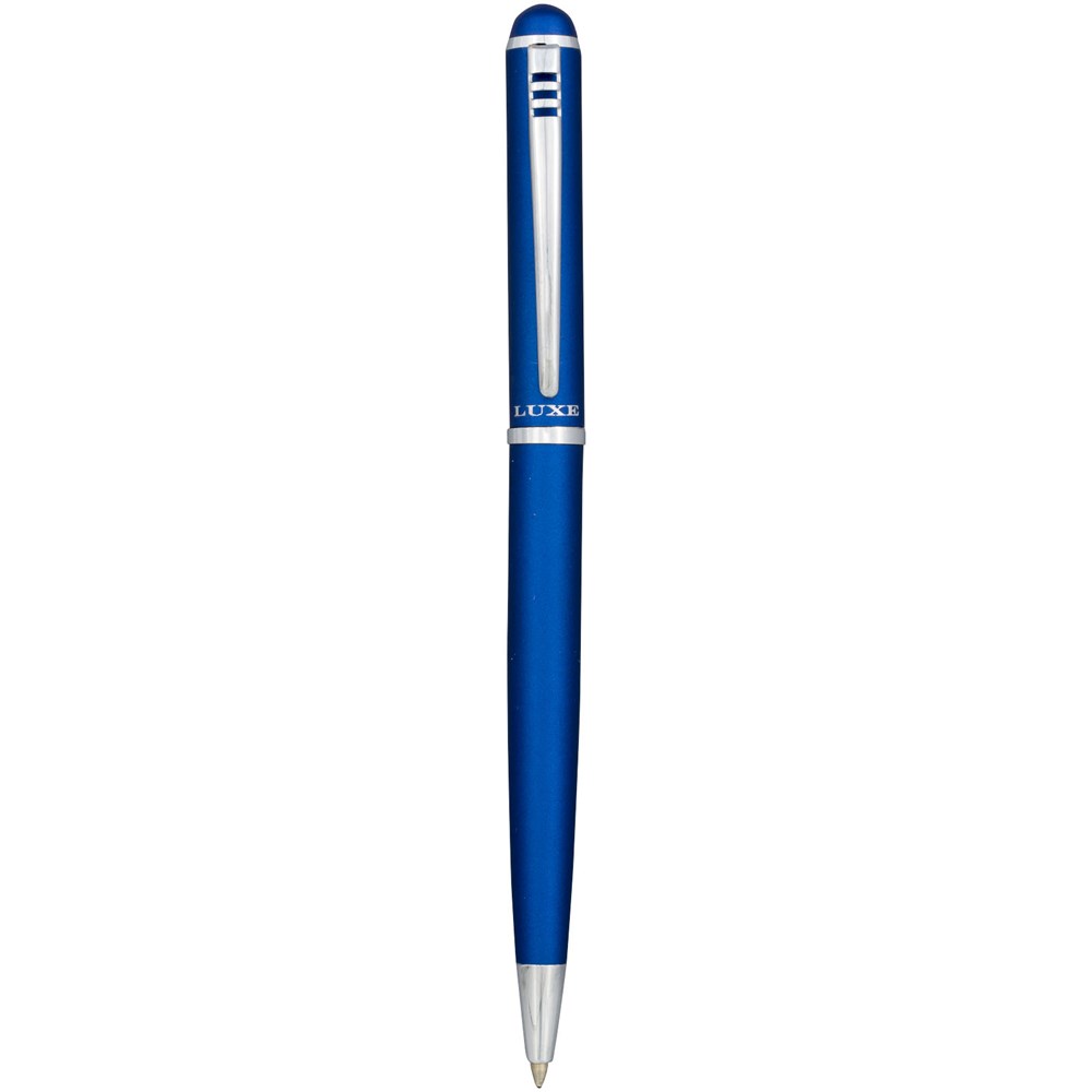 Exclusief ontworpen draaibalpen en captype pennenset met roller. Verkrijgbaar in glanzend zwart, matzilver en matblauw. Verpakt in geschenkverpakking ''LUXE'' (17 x 5,5 x 3 cm).