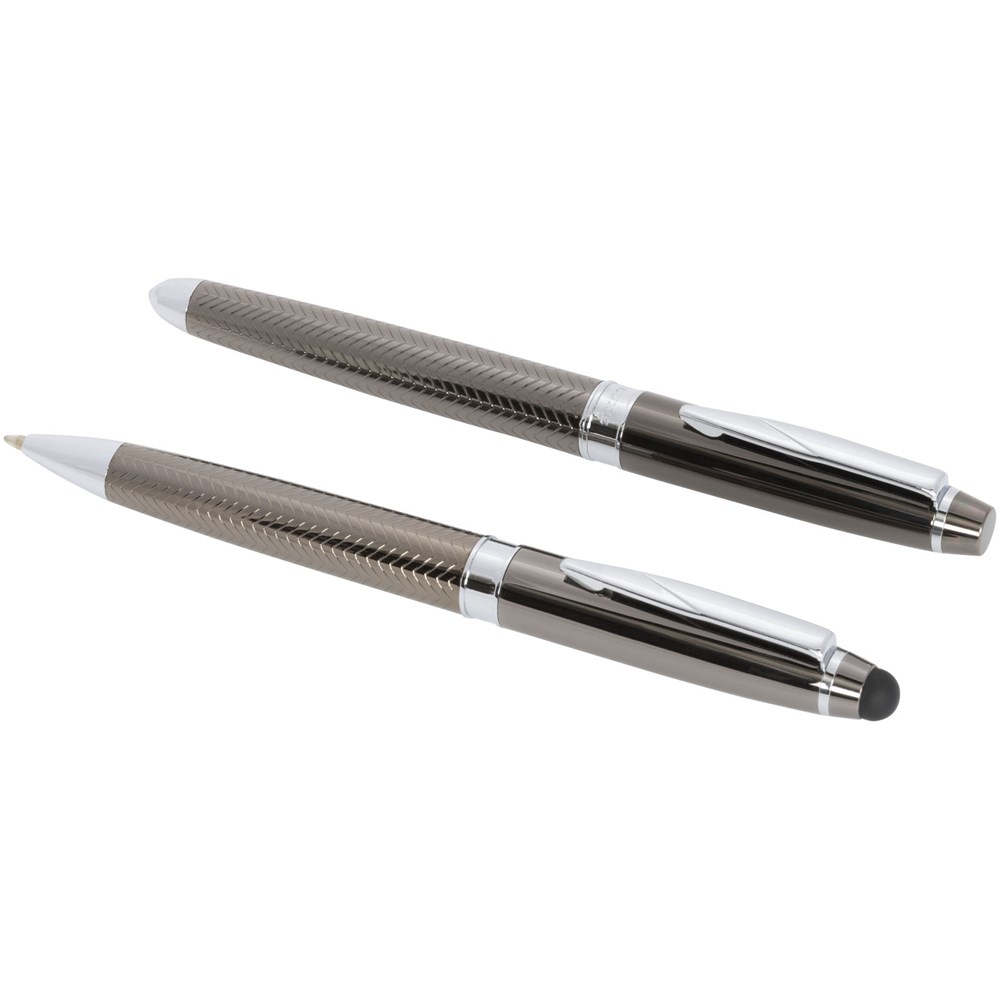 Pennenset met exclusief design met een stylus balpen en rollerpen met premium zwarte inkt navulling. Een zachte rubberen stylustip is geïntegreerd in het uiteinde van de balpen en verwijdert vingerafdrukken en vlekken op uw smartphone of tablet. Compatibel met elk touchscreen apparaat. Ook ideaal voor dagelijks gebruik met openbare touchscreens zoals pinautomaten. Incl. premium zwarte inkt navulling en verpakt in een ''LUXE'' geschenkverpakking. (17 x 5,5 x 3 cm).