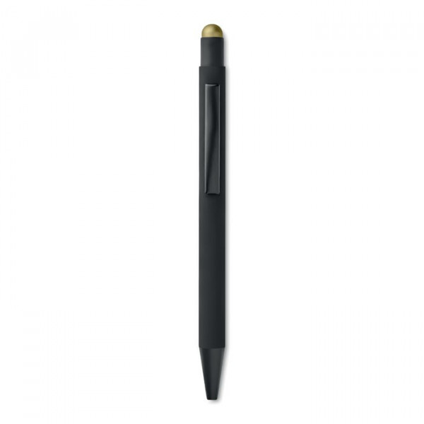 Aluminium stylus balpen met touch tip en drukmechanisme. Bij het graveren van het logo verschijnt de kleur van de touch tip. Blauwe inkt.