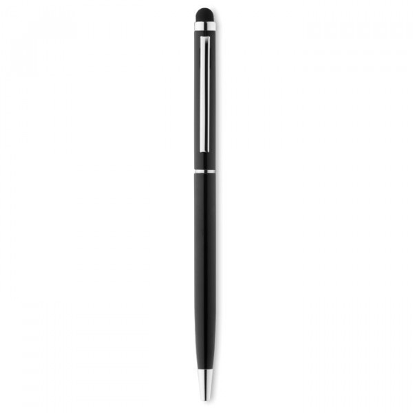 Aluminium balpen met glimmend chromen clip en touch tip. Draaimechanisme, blauwe inkt.