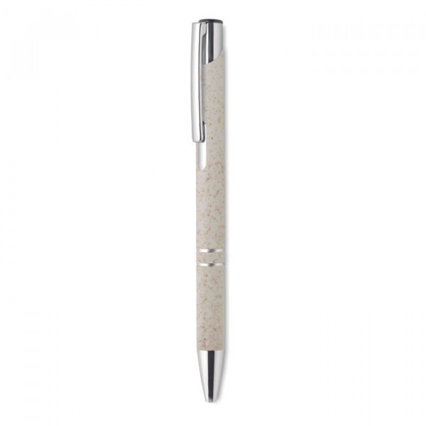 Balpen met drukmechanisme en zilveren details. Behuizing is van 50% tarwestro en 50% ABS-materiaal. Blauwe inkt.