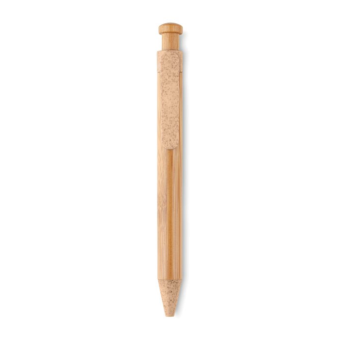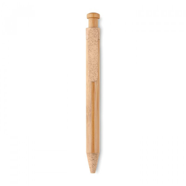 Balpen met drukmechanisme, een bamboe behuizing en gekleurde details in 50% tarwestro/50% ABS. Blauwe inkt.