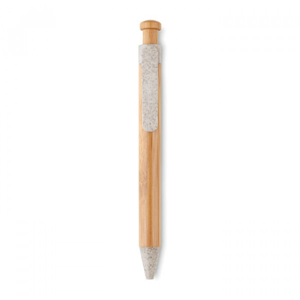 Balpen met drukmechanisme, een bamboe behuizing en gekleurde details in 50% tarwestro/50% ABS. Blauwe inkt.