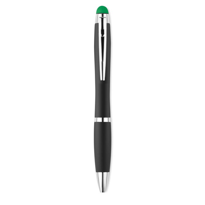 ABS metallic balpen met lichtje, touch tip en zachte grip. Bij het graveren van het logo licht het logo op. Bij tampondruk licht het logo niet op. Blauwe inkt en draaimechanisme. Inclusief 3x AG3 batterijen.