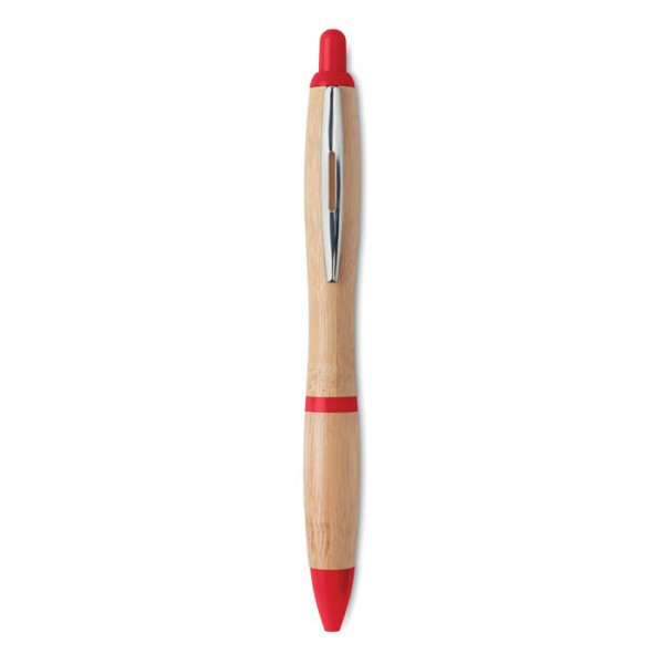Bamboe balpen met gekleurde kunststof details. Drukmechanisme. Blauwe inkt.