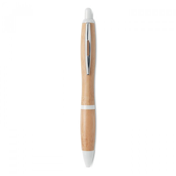 Bamboe balpen met gekleurde kunststof details. Drukmechanisme. Blauwe inkt.