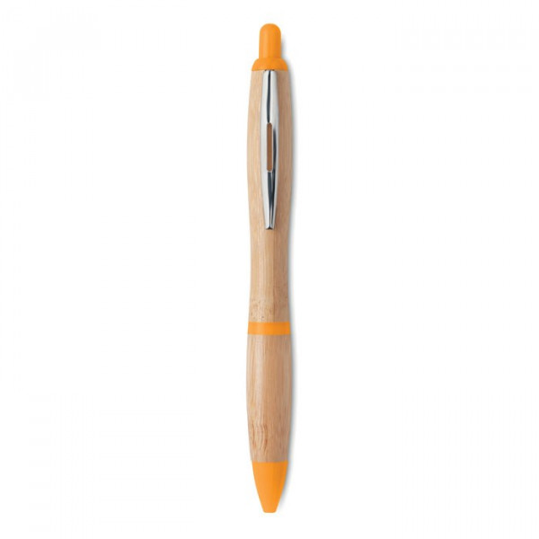 Bamboe balpen met gekleurde kunststof details. Drukmechanisme. Blauwe inkt.