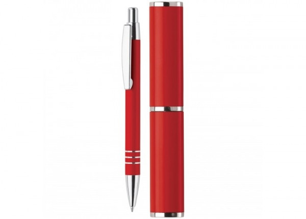 Aluminium balpen met drie verchroomde ringen. De balpen zit verpakt in een aluminium koker.