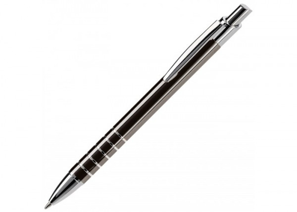 Aluminium balpen in diverse kleuren met vijf ringen met zilveren afwerking. Vanaf 50 stuks enkelnaamsgravering mogelijk. Zwartschrijvende kunststof vulling.