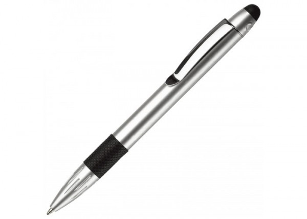 Balpen met draaimechanisme en rubberen grip inclusief stylusfunctie. De balpen wordt voorzien van een laser gravering en de geïntegreerde LED-lampjes zullen het logo en/of de bedrijfsnaam oplichten.
