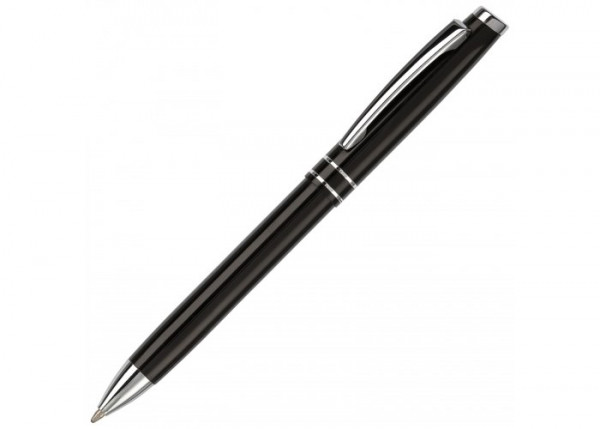 Blauwschrijvende aluminium balpen met twee strepen. Lasergravure mogelijk.