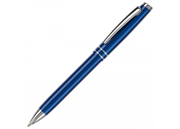 Blauwschrijvende aluminium balpen met twee strepen. Lasergravure mogelijk.