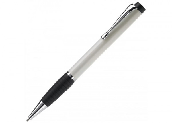 Gelakte metalen balpen met verchroomde delen en rubberen grip in zwart. De pen bevat een blauwschrijvende metalen Jumbo vulling. Lasergravering mogelijk.
