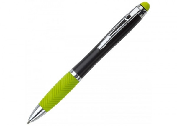 Balpen met draaimechanisme en rubberen grip inclusief stylusfunctie. De balpen wordt voorzien van een laser gravering en de geïntegreerde LED-lampjes zullen het logo en/of de bedrijfsnaam in de kleur van de rubberen grip oplichten.