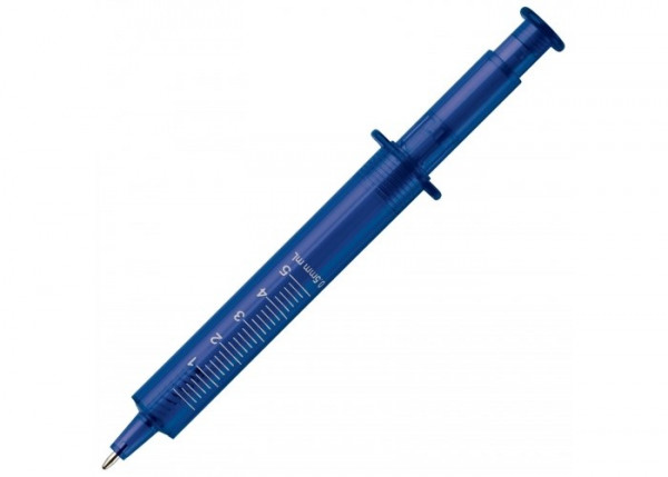 Transparante pen in de vorm van een spuit. Verkrijgbaar in verschillende kleuren.