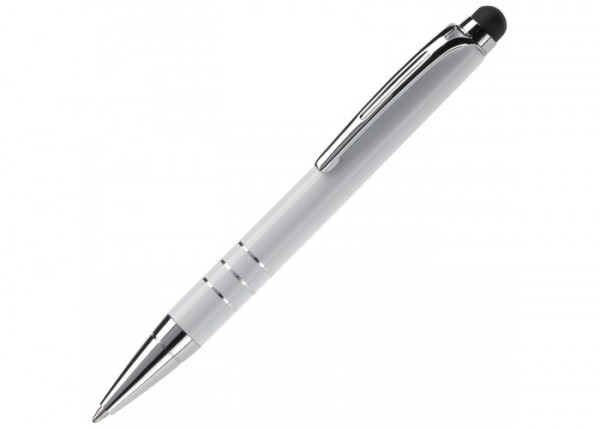 Kleine, aluminium balpen met touchscreen bovenkant. Pen is voorzien van draaimechanisme.