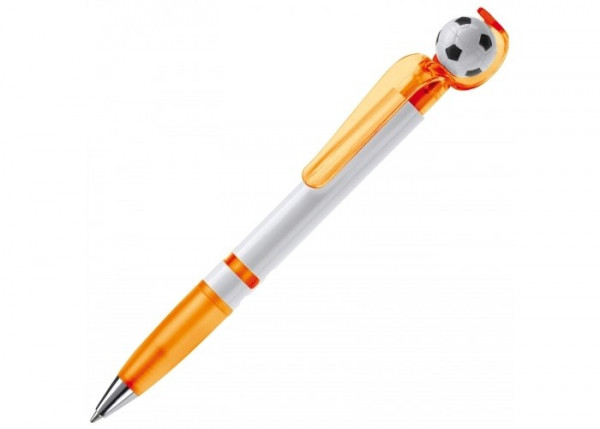 Plastic balpen met voetbal en transparante onderdelen. Voetbal kan ronddraaien. Blauwschrijvend.