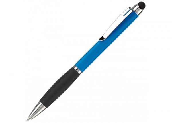 Kunststof touchscreen pen met metalen clip en zwarte rubberen grip. Draaimechanisme. Blauwschrijvend.