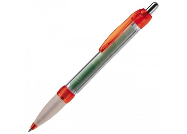 Transparante balpen met rubberen grip. Met full-colour banner bedrukking aan twee zijden. Blauwschrijvende X20 vulling. Bedrukking op de houder of clip mogelijk.