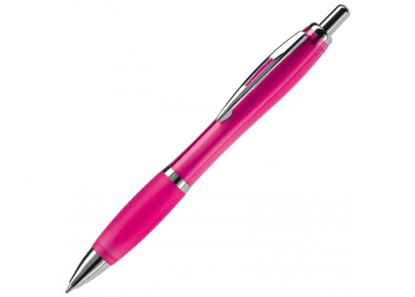 Transparante balpen met metalen clip, metal look drukknop, tussenring en penpunt. Blauwschrijvende Jumbo vulling. Vanaf 10.000 stuks andere schrijfkleur mogelijk.
