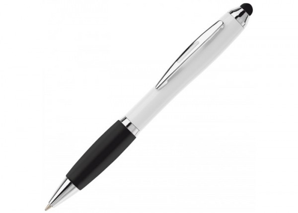 Balpen met touchscreen punt en frosty grip, draaimechanisme en metalen punt, metal look ring en clip. Blauwschrijvende X20 vulling.