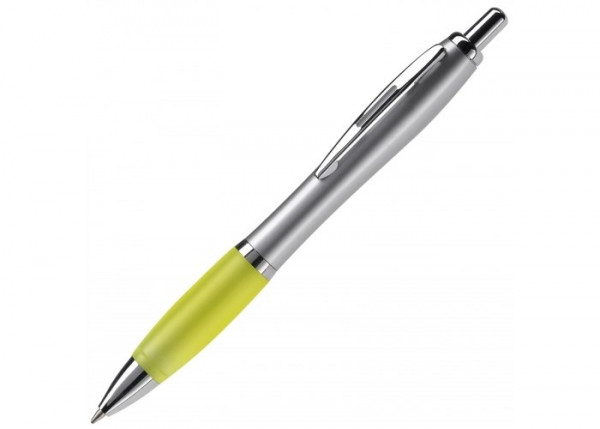 Zilveren balpen met metalen clip, gekleurde grip en een 'metal-look' drukknop, ring en punt. De pen bevat een blauwschrijvende Jumbo vulling.