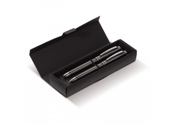 Metalen schrijfset met balpen en rollerbal. Balpen met twistfunctie. Rollerball voorzien van dop. Blauwschrijvend. Stijlvolle schuine bovenkant met twee zilverkleurige ringen.