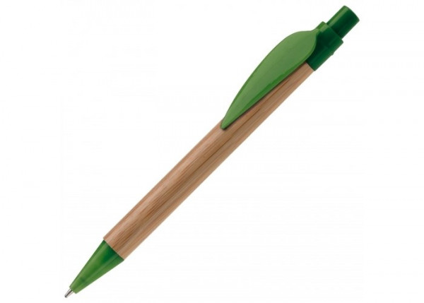 Ecologische bamboe balpen met de clip in de vorm van een blad. Drukker en onderstuk gekleurd. Zwartschrijvende X20 vulling. Bedrukking op de clip mogelijk.