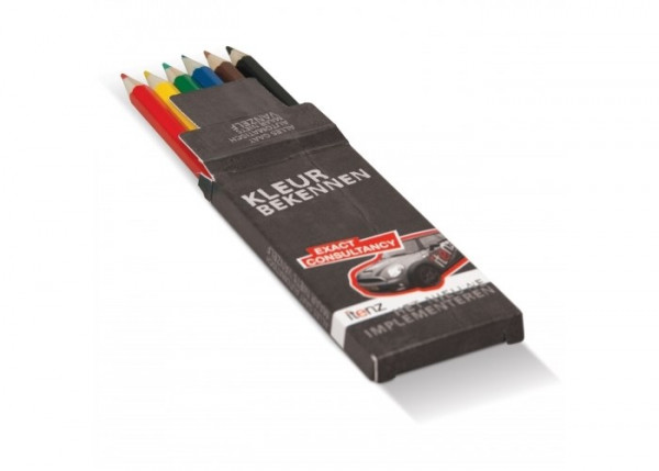 Zes kleine kleurpotloden in custom-made full-colour doosje.