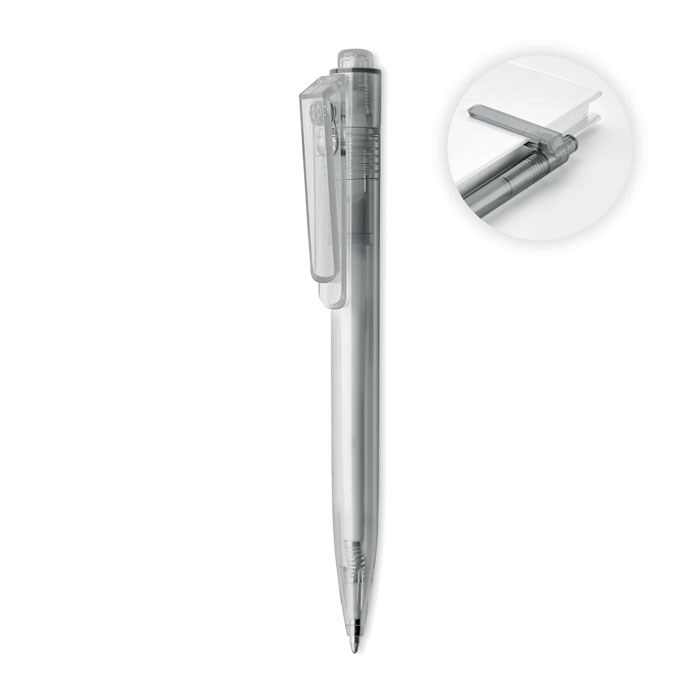 RPET balpen met drukmechanisme en 360 graden draaibare clip voor perfecte bevestiging aan je notitieboek.