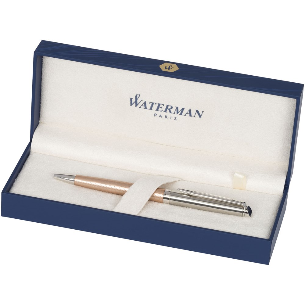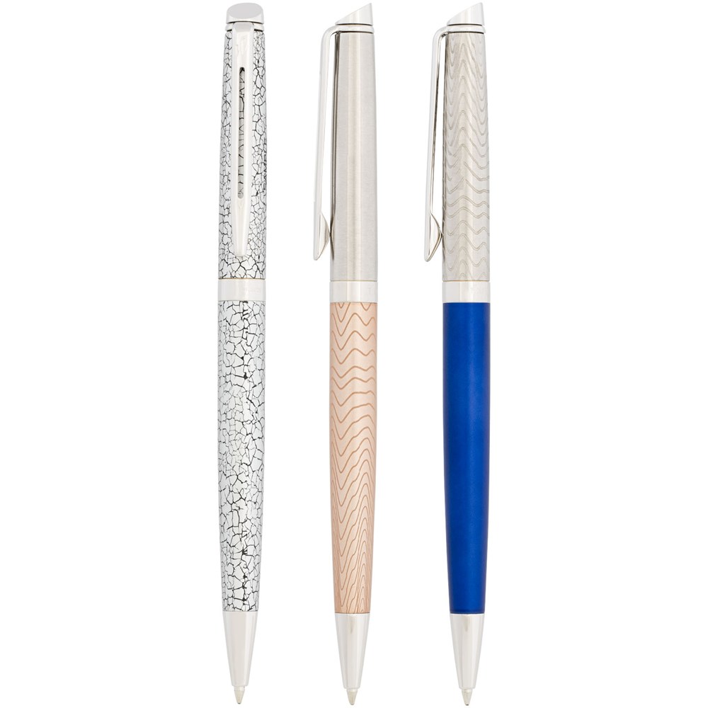 Nieuwe premium Hémisphère-collectie met vloeiende laserpatronen die respect hebben voor de mooie vorm van de pennen en perfect inspelen op de trends van natuurlijk/organische elementen. Verkrijgbaar als balpen, rollerballpen en vulpen en in 3 kleuren/designs: Een levendige blauwe lakafwerking compleet met op de bovenkant een gedetailleerd geëtst patroon , een verfijnde roze afwerking met een subtiel geëtst patroon en een onvoorspelbaar en gedetailleerd patroon in combinatie met palladium randen. Verpakt in een Waterman geschenkverpakking.