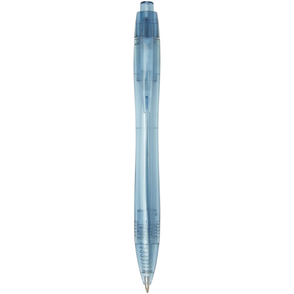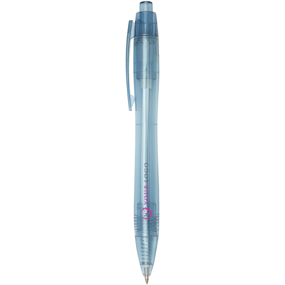 Balpen met klikmechanisme en transparante houder. De houder is gemaakt van gerecyclede waterflessen, wat bijdraagt aan het verminderen van de hoeveelheid plastic afval.