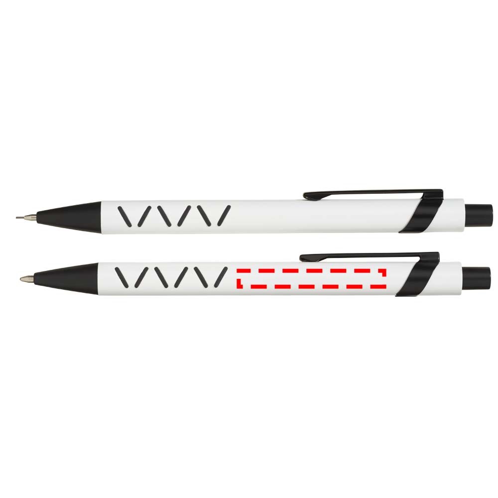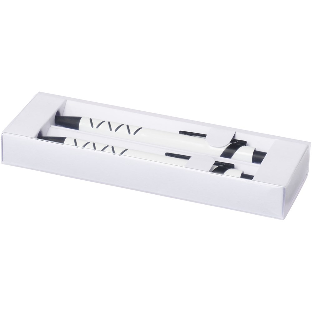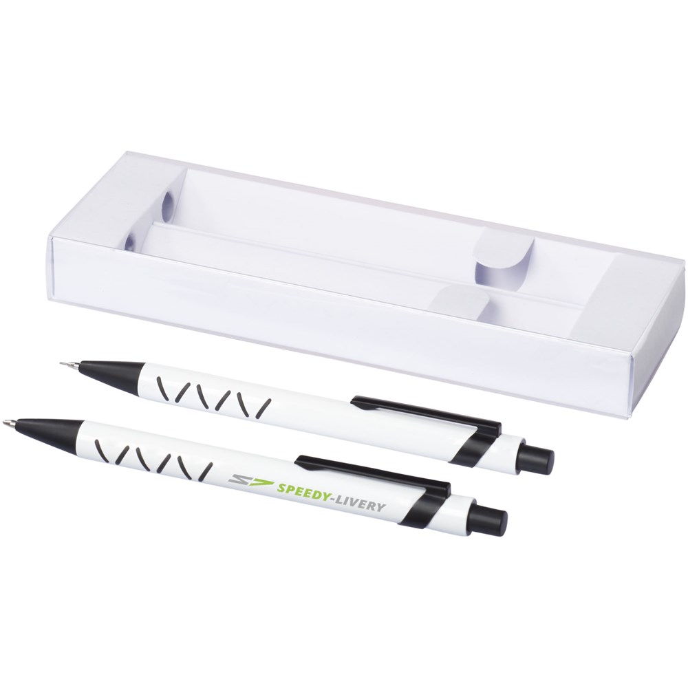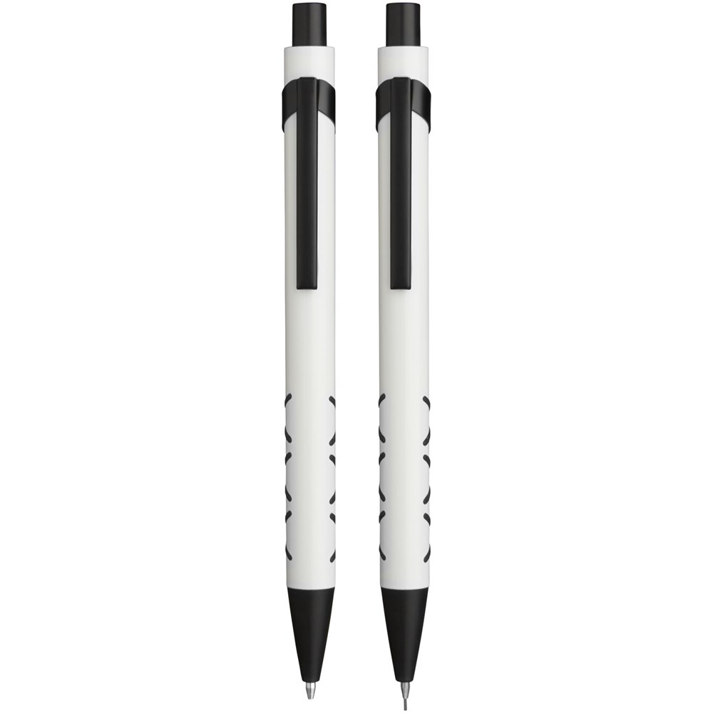 Balpen en mechanisch potlood met klikmechanisme in een bijpassende papieren geschenkverpakking. Zwartschrijvend.