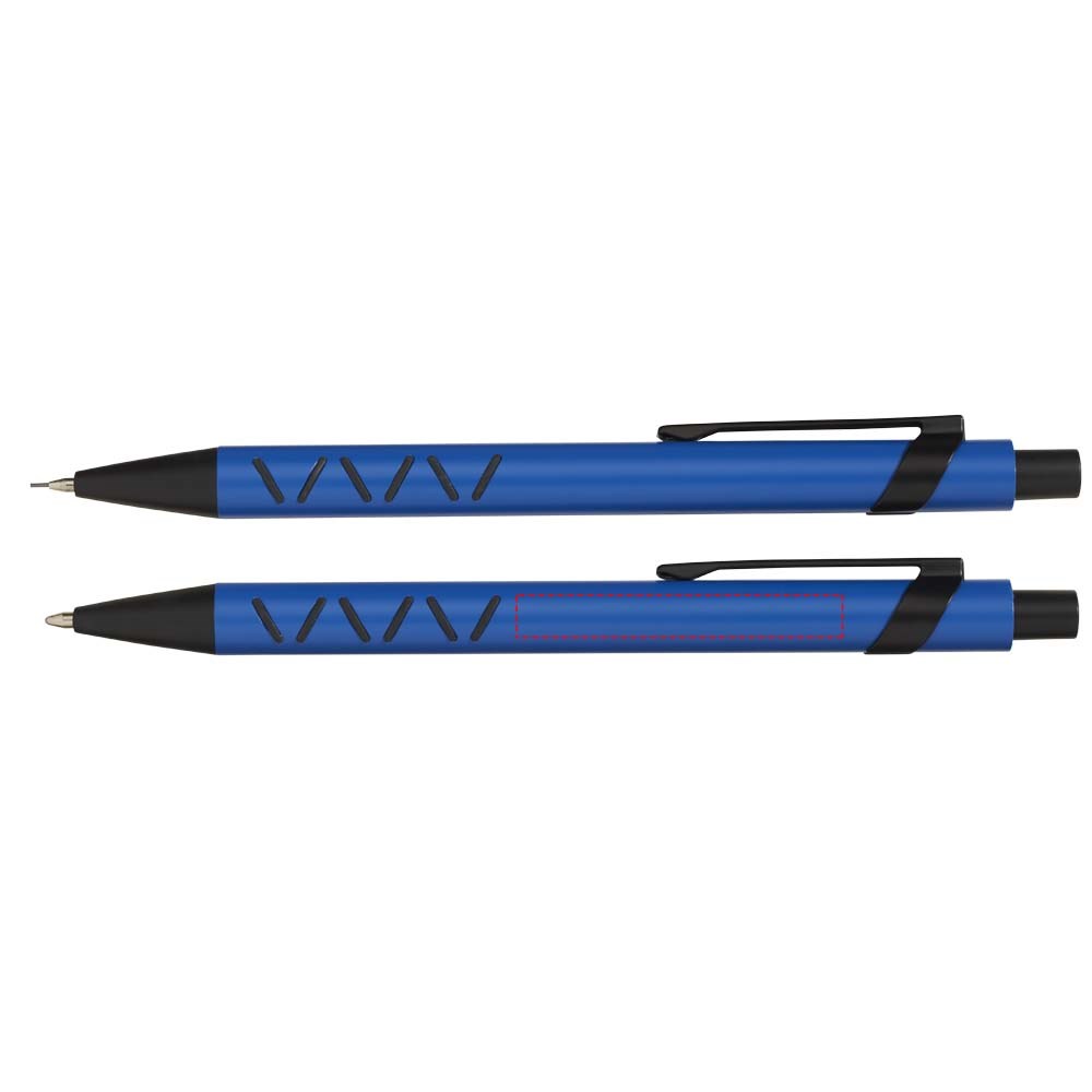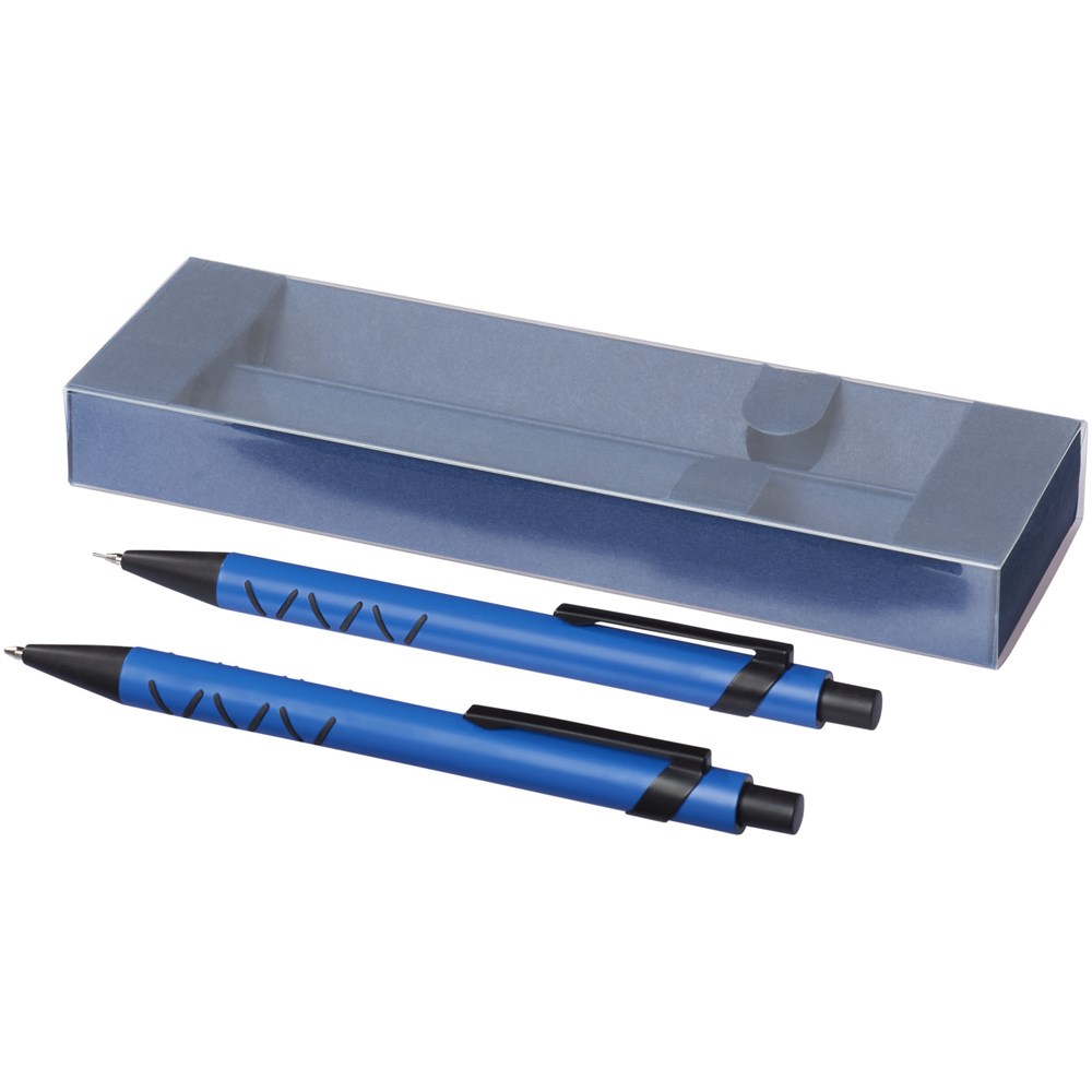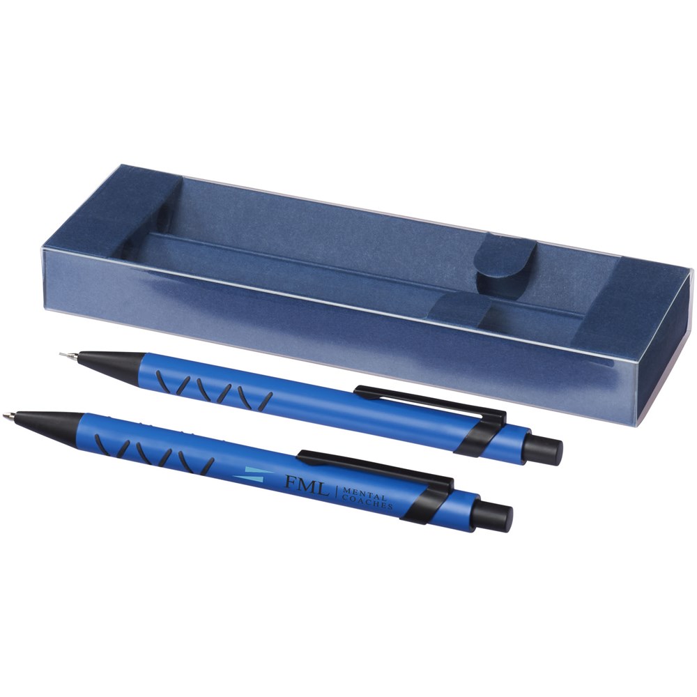 Balpen en mechanisch potlood met klikmechanisme in een bijpassende papieren geschenkverpakking. Zwartschrijvend.