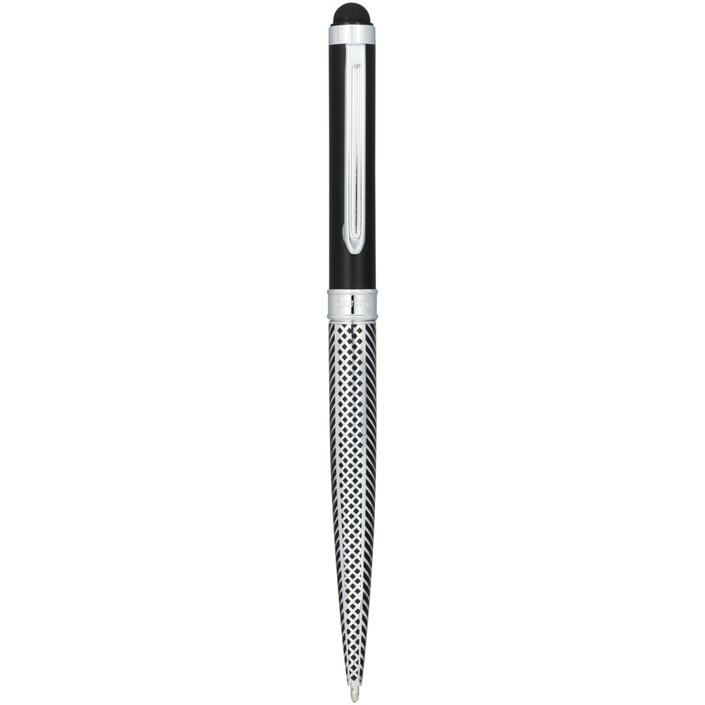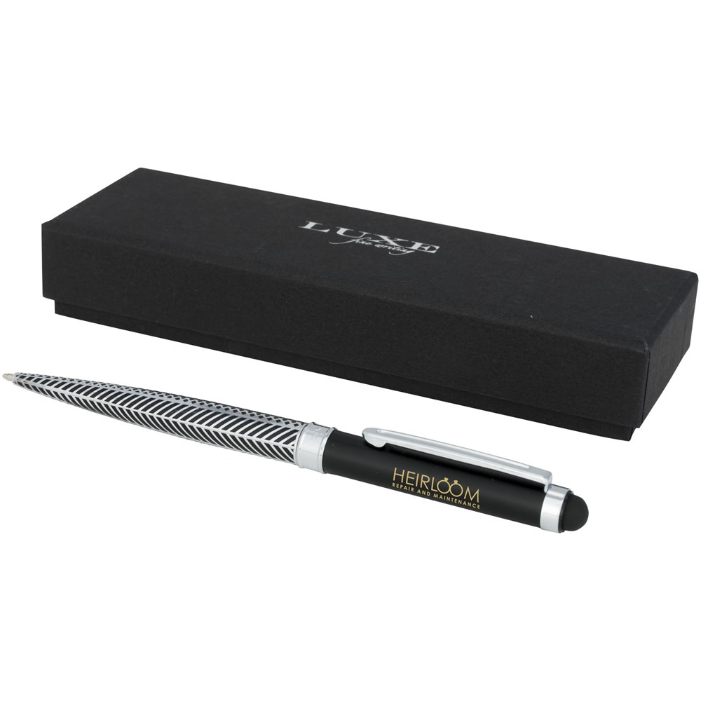 Stylus balpen met exclusief design en stijlvol patroon onderaan de huls. Incl. hoogwaardige blauwe navulling en verpakt in een ''LUXE'' geschenkverpakking (16,5 x 4,5 x 2,8 cm).