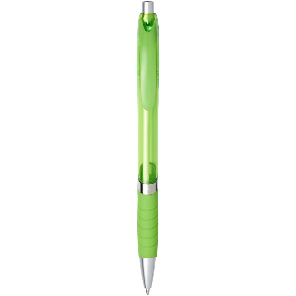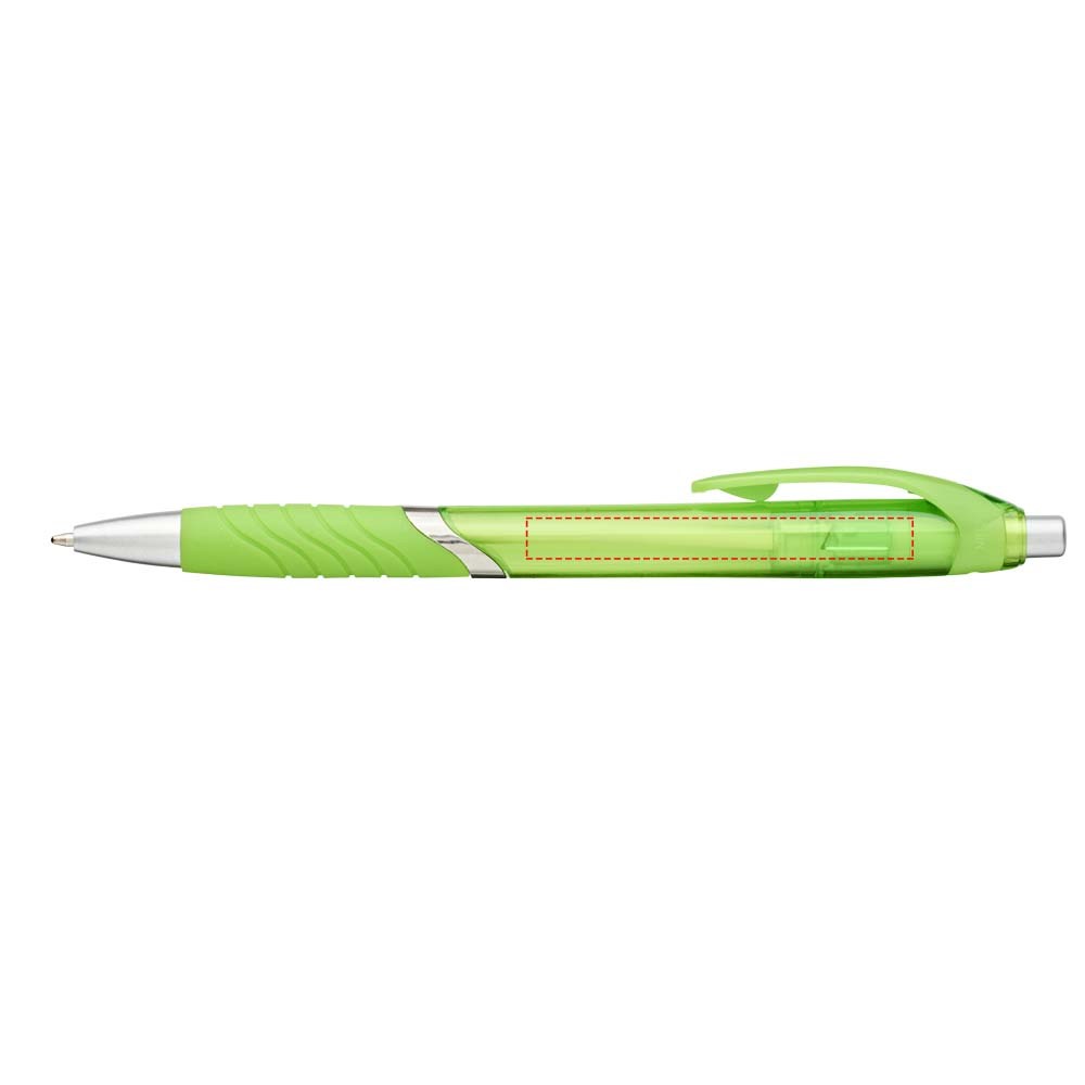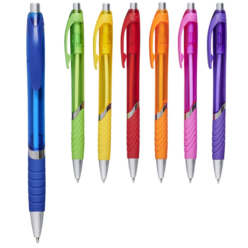 Populaire balpen met klikmechanisme en felgekleurde doorschijnende huls met bijpassende kleurenclip en rubberen grip. Verkrijgbaar in diverse aantrekkelijke kleuren.