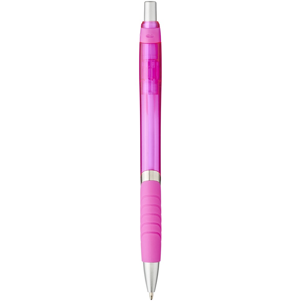 Populaire balpen met klikmechanisme en felgekleurde doorschijnende huls met bijpassende kleurenclip en rubberen grip. Verkrijgbaar in diverse aantrekkelijke kleuren.