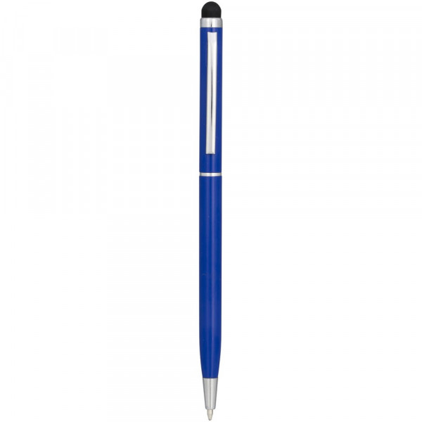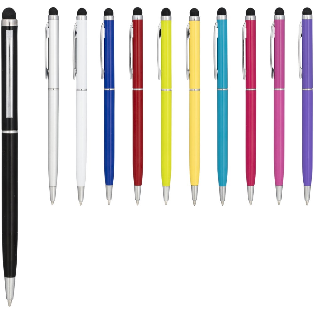 Slank vormgegeven balpen van aluminiumglazuur. Met draaimechanisme en stylus.