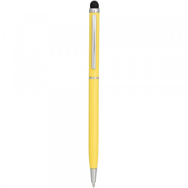 Slank vormgegeven balpen van aluminiumglazuur. Met draaimechanisme en stylus.