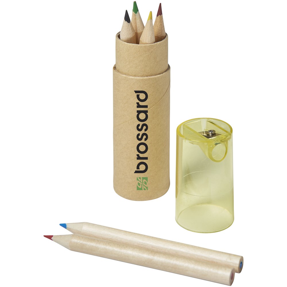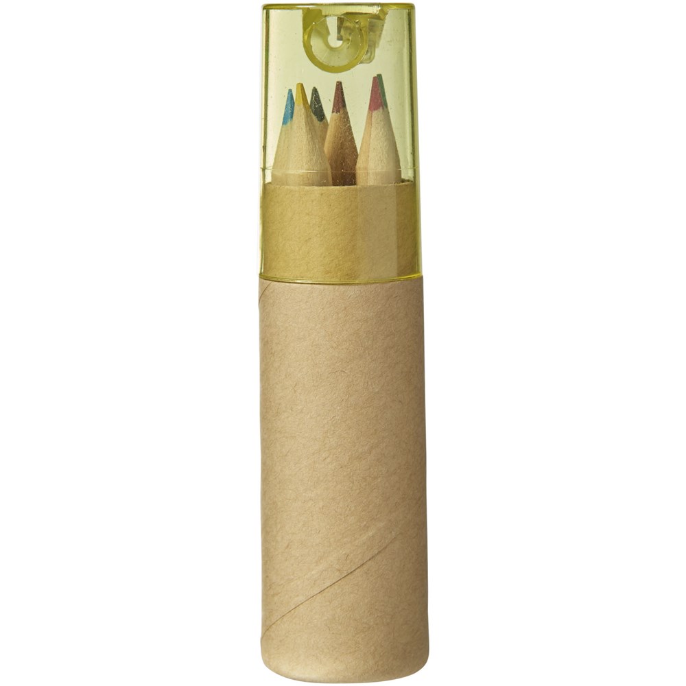 Set van 6 kleurpotloden in een kartonnen koker met kunststof deksel en puntenslijper. Decoratie is niet mogelijk op de inhoud.