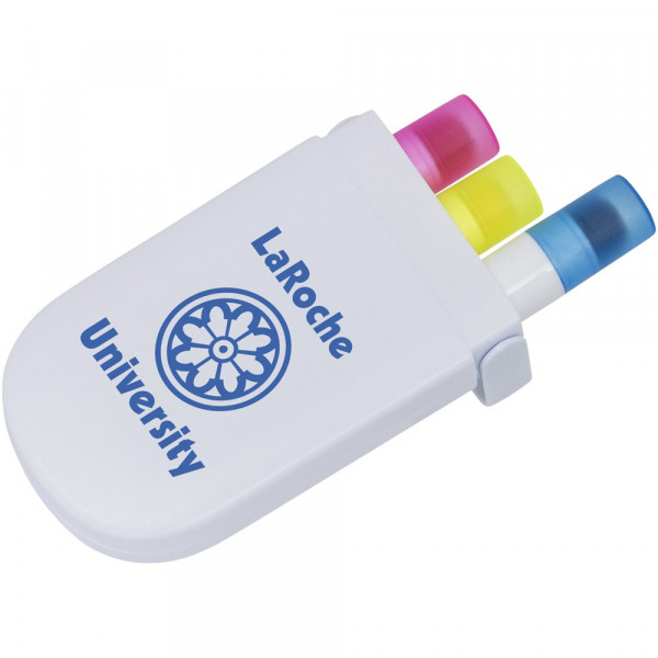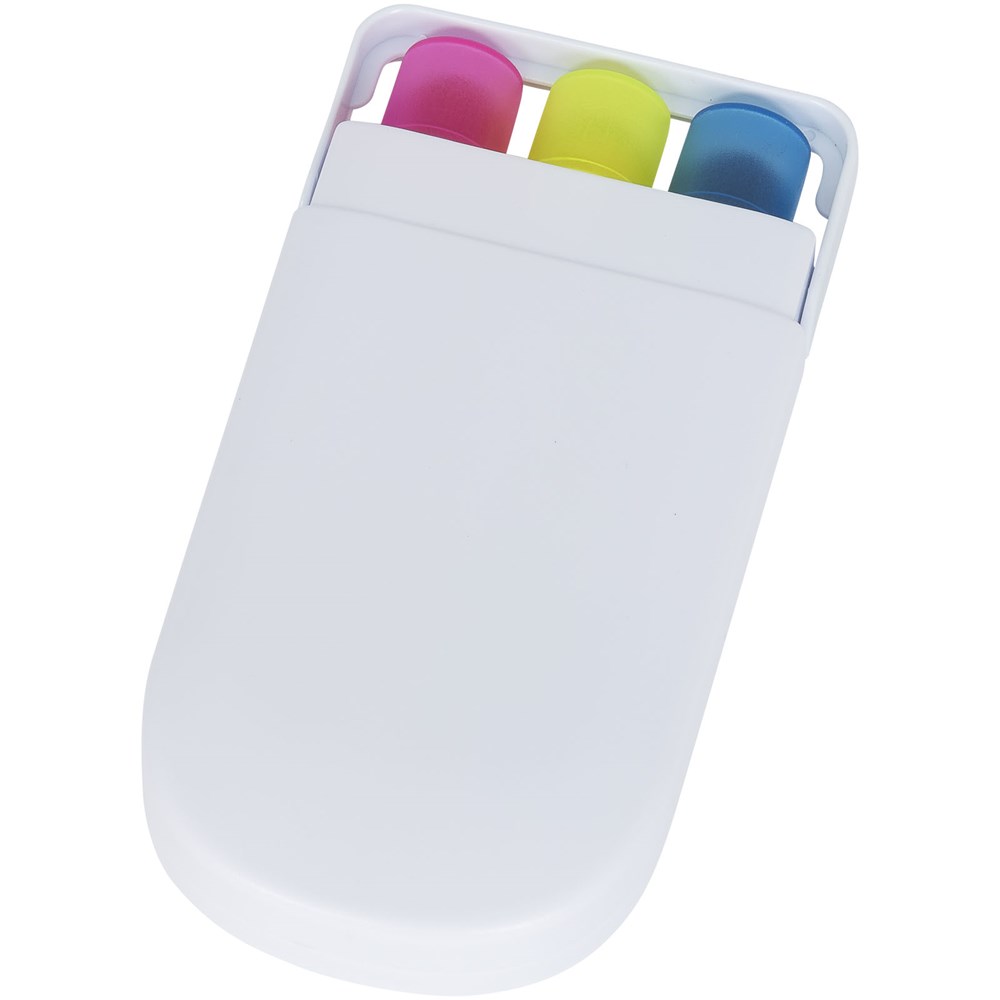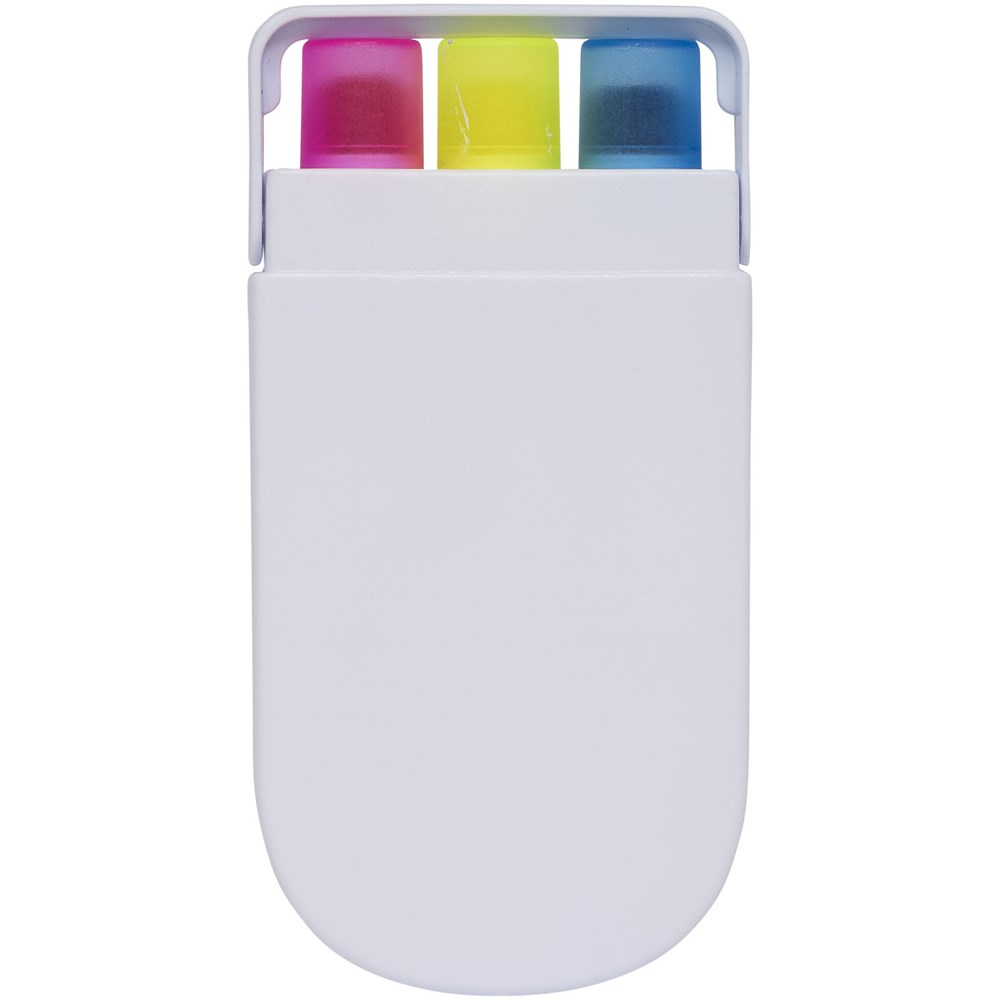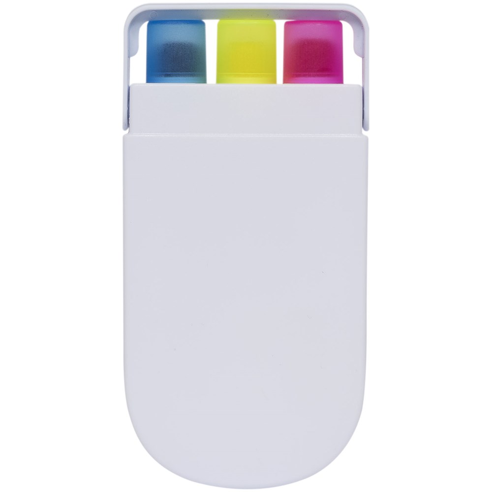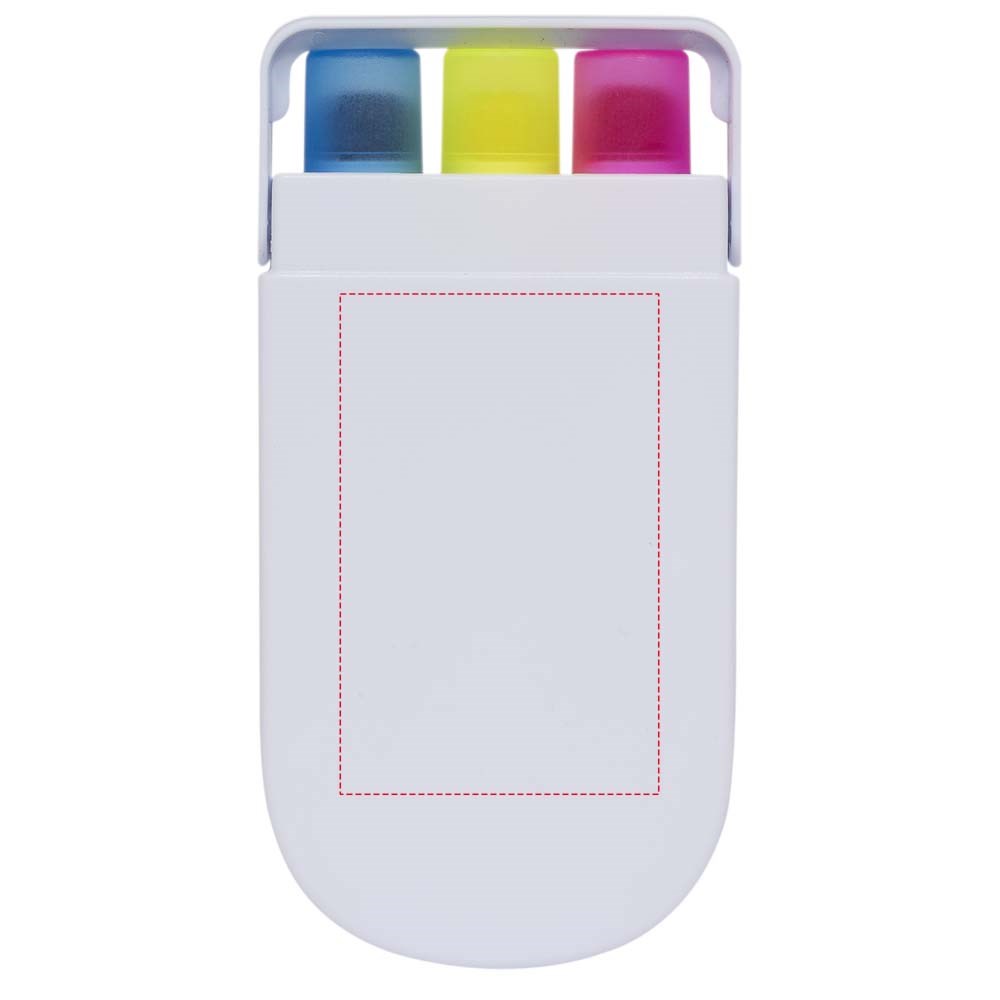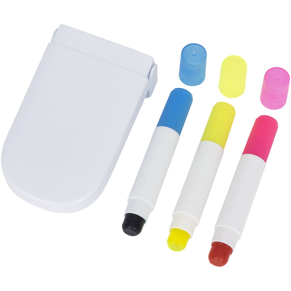 De witte plastic behuizing bevat drie verschillende gekleurde gelmarkers.
