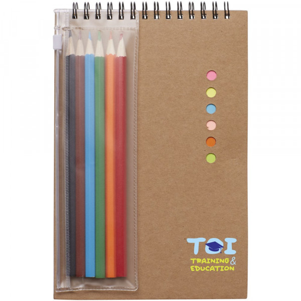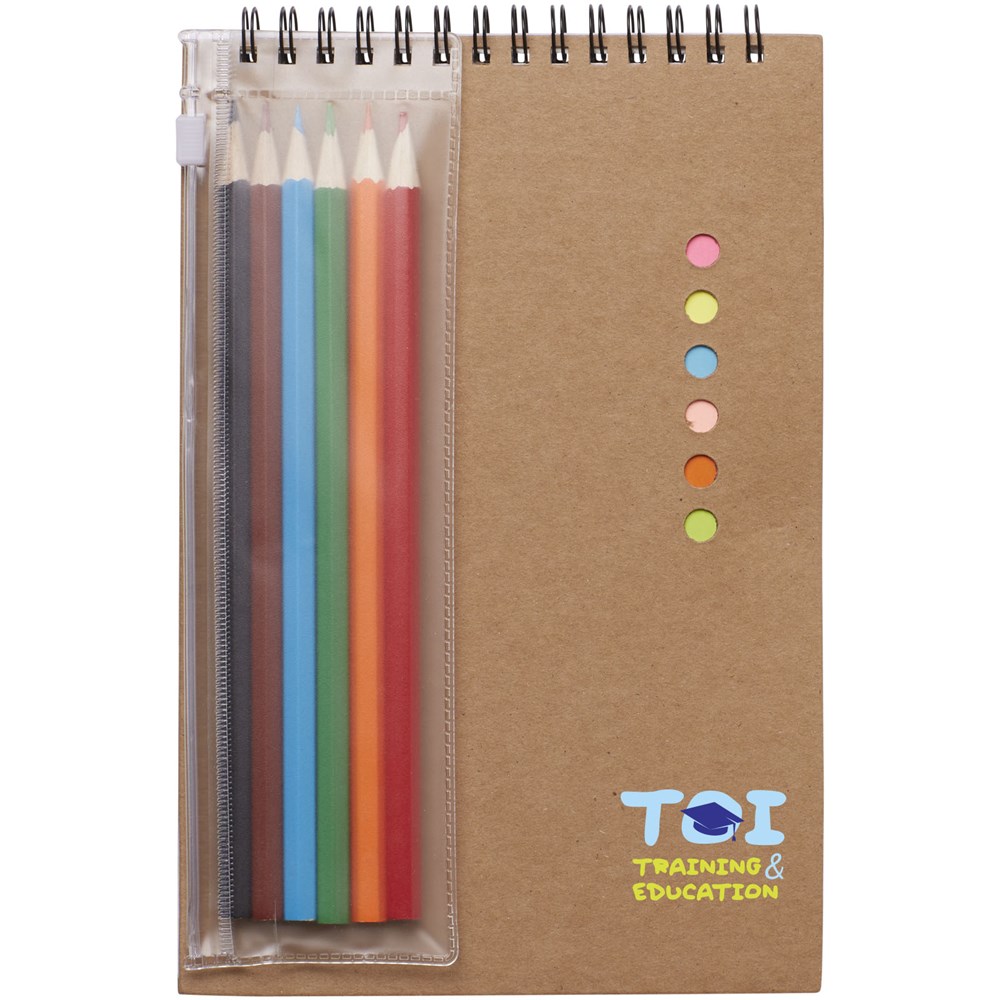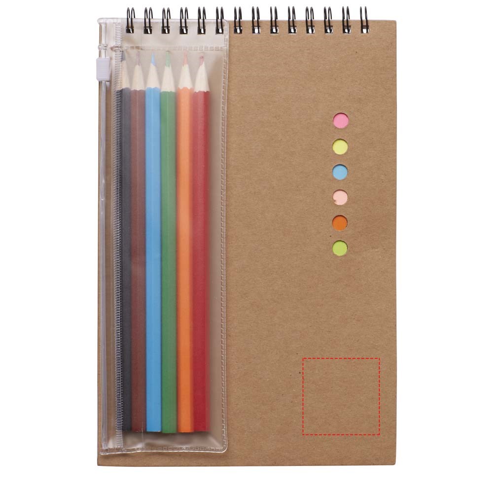 Set bevat 6 kleine sticky notes, 10 gekleurde pagina's, 30 blanco pagina's en 6 gekleurde potloden.