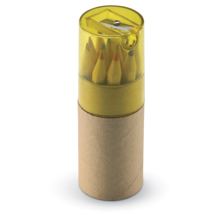 12 Kleurpotloden in koker. Transparant deksel met puntenslijper.